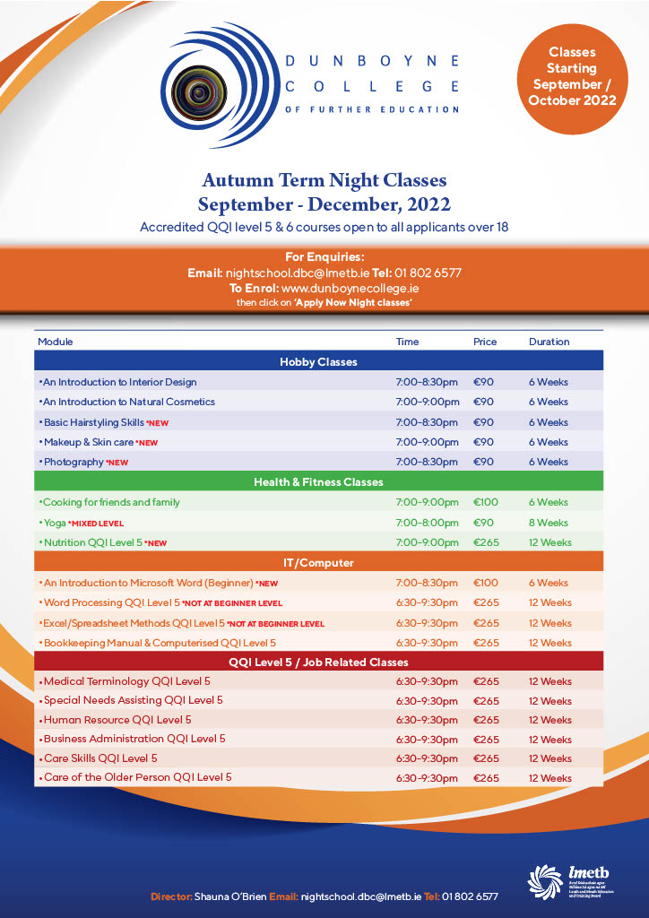 ● Dunboyne College offers many different classes to suit the individual learner. We have the option of Hobby classes, Computer Classes or job-related classes for those looking to achieve a qualification at Level 5 or 6. All our classes run on a Tuesday evening on-site.