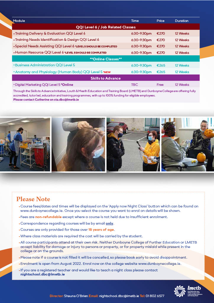 ● All course participants attend at their own risk. Neither Dunboyne College of Further Education, nor LMETB, accept liability for damage or injury to persons or property, or for property mislaid while present in the college or on the grounds.